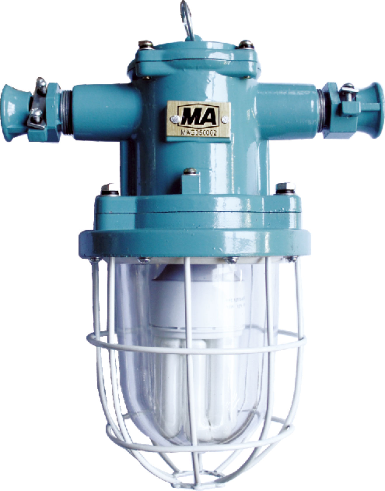 13W熒光燈由上蓋、上殼體、下殼體、防爆透明玻璃罩、金屬保護(hù)網(wǎng)等組成,上蓋與上殼體用M4螺釘連接,下殼體用M6螺釘與上殼體相連。防爆透明玻璃罩、護(hù)罩用M4螺釘固定在下殼體上。上殼體外有M4外接地螺釘、銘牌等,上殼體內(nèi)有接線板、M4內(nèi)接地螺釘、直口式壓接燈頭。下殼內(nèi)有密封墊、防爆透明玻璃罩及金屬保護(hù)網(wǎng),燈頭與電源采用直口式壓接方式。上蓋、上殼體、下殼體、防爆透明玻璃罩之間均有符合規(guī)定的隔爆接合面隔爆。